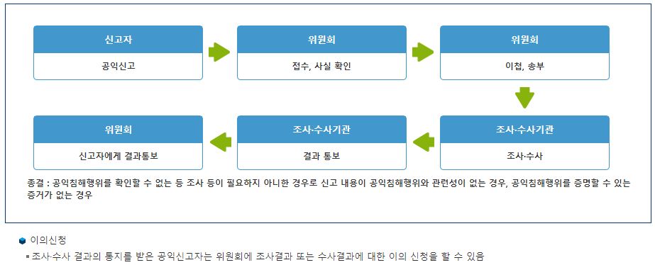 - 공익신고 처리 절차(국민권익위원회) : 신고 접수 60일 이내에 사실 확인을 마친 후 조사․수사기관에 이첩하고, 처리 결과를 신고자에게 통보