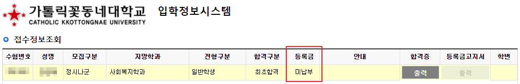합격자 발표 및 등록 (등록금 납부)
