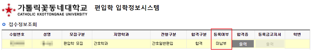 ○ 등록금고지서를 출력하여 지정계좌로 등록금납부(고지서 출력은 2.13(화) 15시부터 가능 ○ [합격자조회 홈페이지(바로가기)] → [로그인(성명, 생년월일)] → [등록금고지서 출력] ○ 등록금납부 확인 방법은 합격자 조회 홈페이지에서 아래의 그림과 같이 등록여부란에 ‘납부’로 표기(24시~16시납부는 17시이후 확인, 17시~24시납부는 익일 9시 이후 확인 가능)